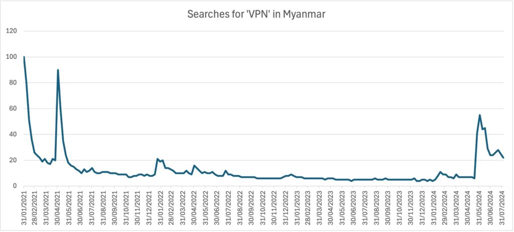 There was a spike in Google searches for VPNs immediately after the recent block was imposed – the third largest surge since the coup, Google Trends data shows, with the highest number of searches coming from Sagaing Region, followed by Mandalay Region then Kayah State. Searches overall increased by 2,333pc on May 30, compared to the daily average over the previous four weeks, according to data collected by Top10VPN.